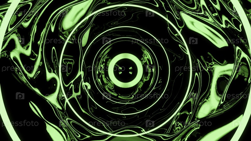 Зеленый и розовый фон.Дизайн.Светящиеся обручи, стоящие в ряд, создают коридор и яркое объемное освещение мигает с потолка в абстракции