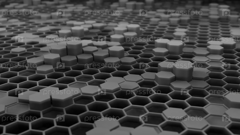 Ближайшее изображение текстурированного шестиугольного узора в оттенках серого, сложно демонстрирующего глубину и форму