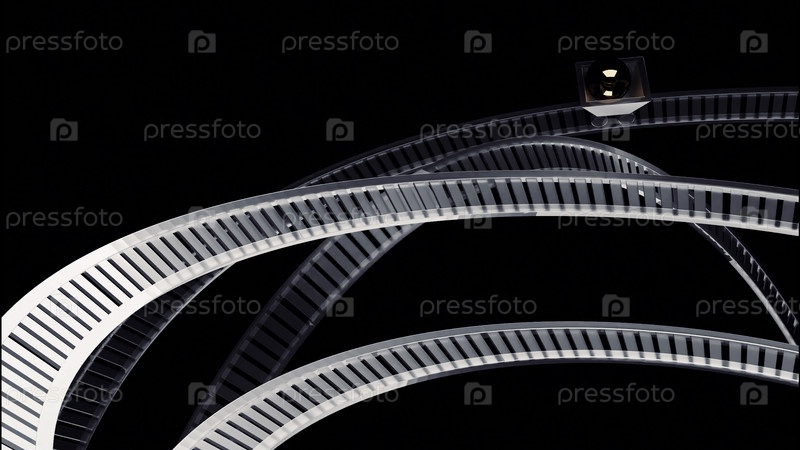 Бесконечная извилистая железнодорожная дорога с движущейся тележкой, концепция бесконечной жизни. Дизайн. Путешествие в никуда, качающийся крошечный вагон на рельсах