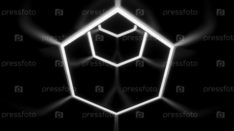 Абстрактные монохромные шестиугольные формы, создающие эффект туннеля.Дизайн.Летание через неоновые рамы