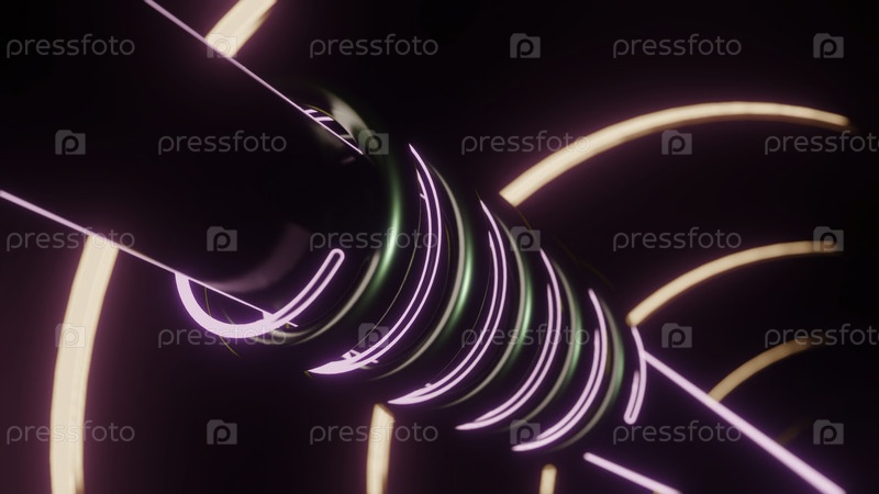 Светящиеся линии вращаются вокруг трубы. Дизайн. Металлическая труба с движущимися спиралями неоновых и металлических труб. Механическая часть с движущимися частями и вращающимися неонными трубами