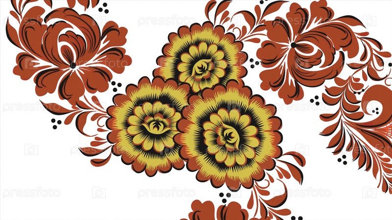 Картина "Хохлома Россия" ярко-красных цветов и ягод на белом фоне Абстрактный фрактальный трансформационный фон Красная хохлома на белом фоне