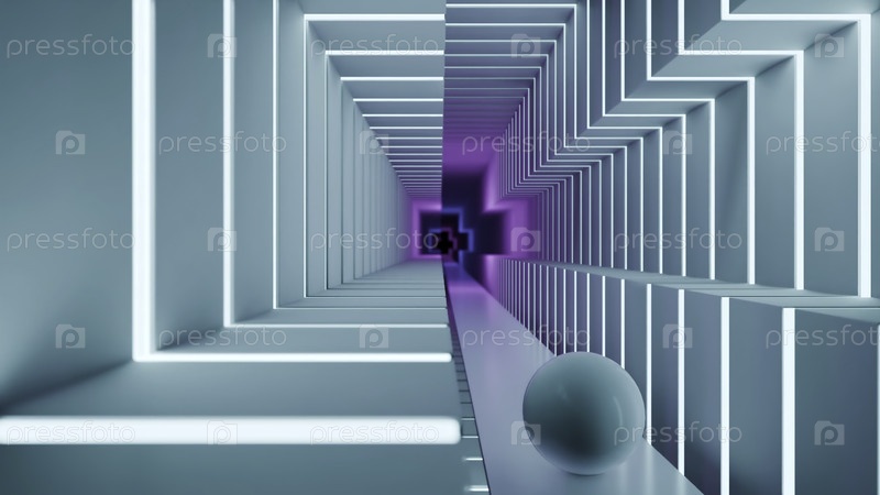 Это увлекательное видео показывает одинокого человека, исследующего завораживающий футуристический тоннель, наполненный яркими неоновыми огнями и центральным сферическим объектом