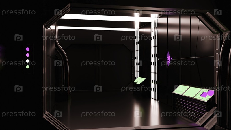 Футуристический 3D коридор с металлическими стенами. Дизайн. 3D-коридор в космическом корабле с неоновыми огнями. Реалистичный коридор в космическом корабле