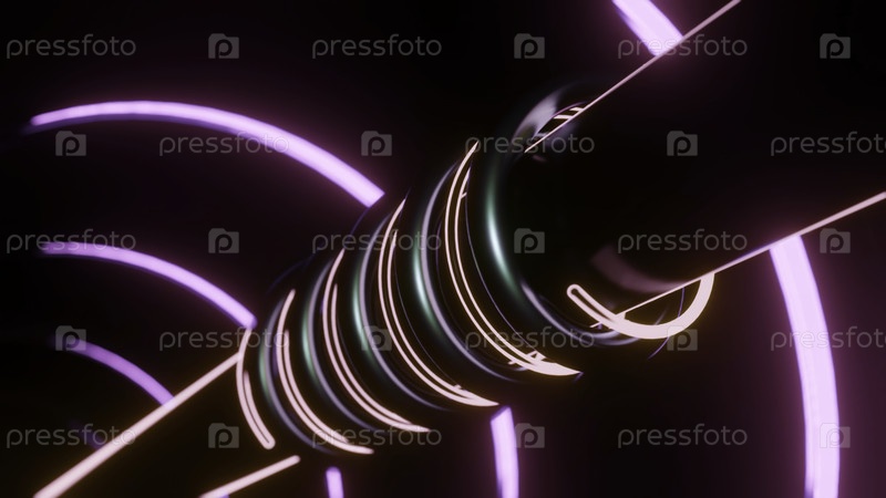 Анимация вращающихся труб с поршнем. Дизайн. Механическая структура с вращающимися трубами вокруг ствола. Тоннель с металлической трубой и движущимися неоновыми линиями