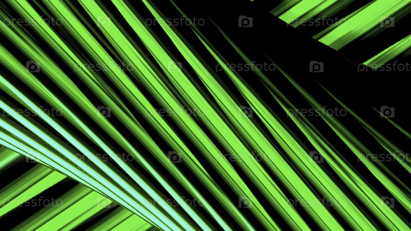 Зелёная и черная вращающаяся 3D-труба, покрытая крутящимися светящимися линиями, бесшовной петлей. Движение. Диагональные цветные полосы медленно протекают за вращающейся большой трубой