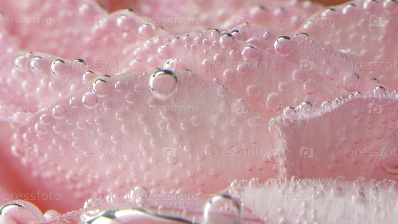 Близкий план деликатных лепестков роз с пузырями. Стоковые кадры. Красивые розовые листья под водой. Листья в чистой воде с пузырьками