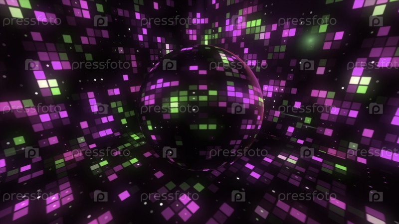 Абстрактный медленно вращающийся диско топ, отражающий красочные квадраты. Движение. Мозаичный рисунок с абстрактными диско лампами в ночном клубе