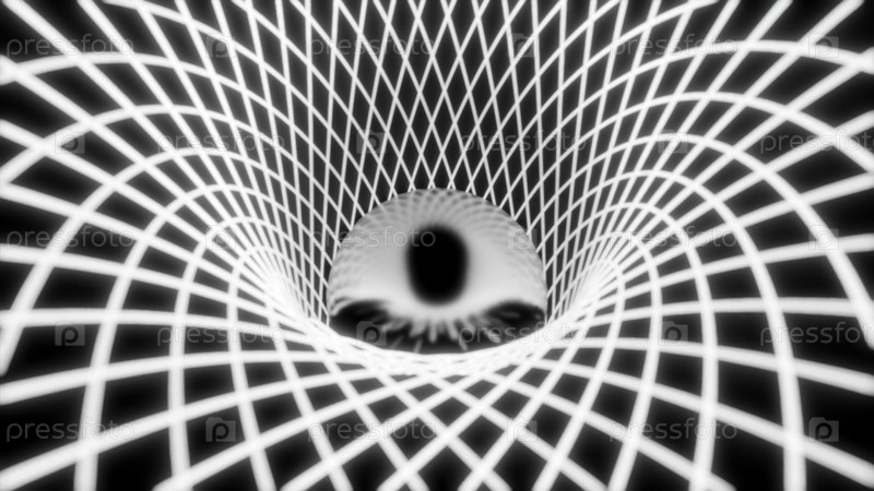 Монохромный глянцевый шар, прокатывающийся внутри ромбового туннеля. Дизайн. Узкие линии, образующие рисунок ромба