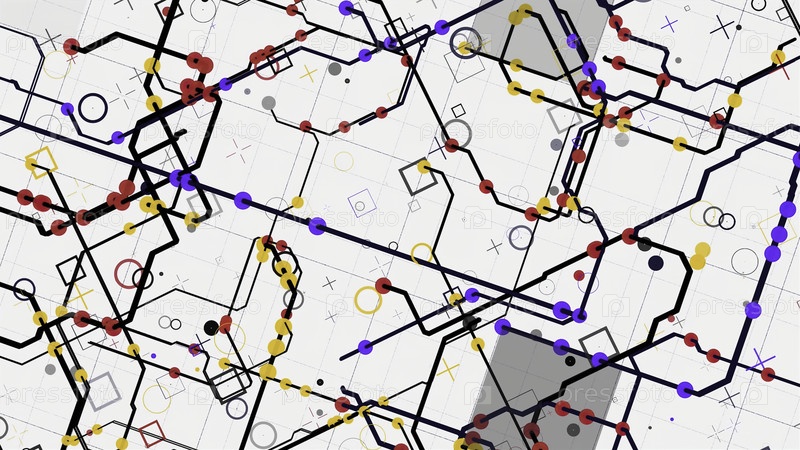 Электрическая схема с яркими абстрактными сигналами, протекающими в разных направлениях на белом фоне. Анимация. Нейронная сеть и большие данные, искусственный интеллект, матричная концепция, бесшовная петля