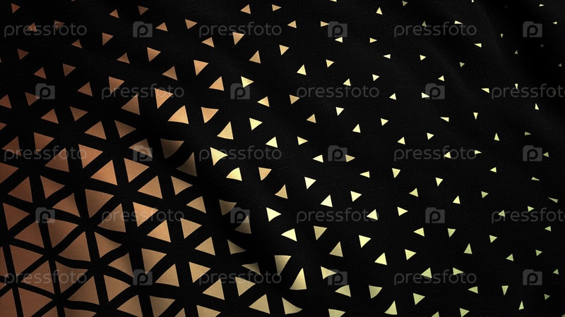 Анимированная 3D-текстура массивной ткани с оранжевыми и черными полосами и треугольниками. Движение. Гладкая поверхность шелковой ткани с морщинами и складками в тканях