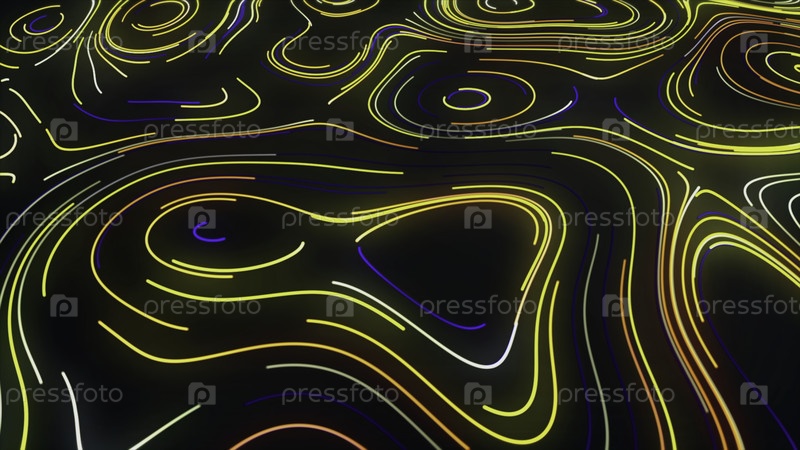Анимация медленно движущихся неоновых линий в рисунке. Движение. Красочные неоновые линии медленно рисуют овальные узоры. Овальные узоры двигающихся светящихся линий на черном фоне