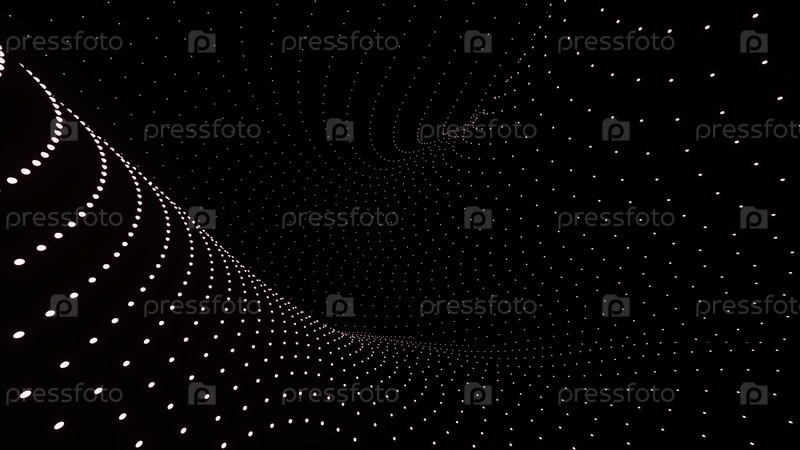 3D-пространство с изогнутым потоком точек. Дизайн. Футуристическое пространство с изгибающимися линиями в течении. Пятнистые линии движутся по геометрической кривой на черном фоне