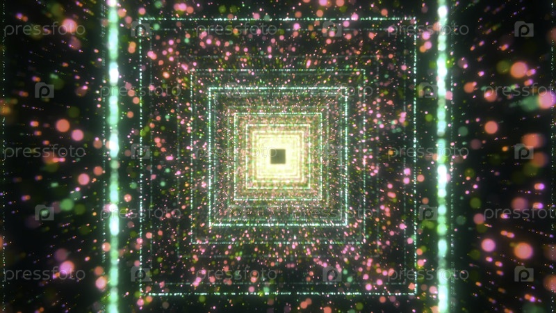 Гипнотический туннель из неонных квадратов и частиц. Движение. Светящийся тоннель с большим количеством частиц и квадратов. Повторяющиеся квадраты создают светящийся туннель
