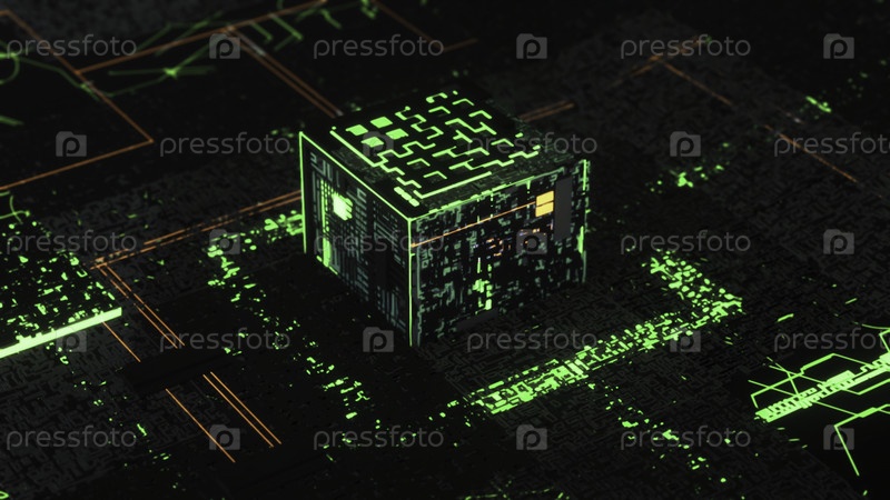 Процессор или микрочип и электронные сигналы на схеме материнской платы, 3D-графики движения. анимация. футуристическая плата с двигающимися электронами с центральным процессором