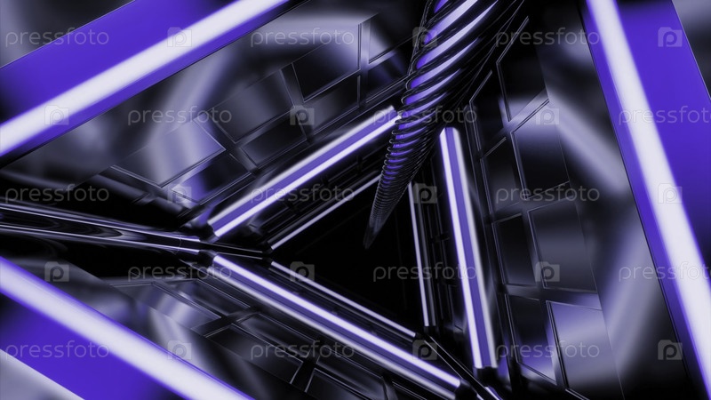 Треугольный трехмерный туннель с металлическими стенами. Дизайн. вращающийся 3D-тунел со веревкой в центре. Жизненная линия в темном тоннеле с неоновыми линиями