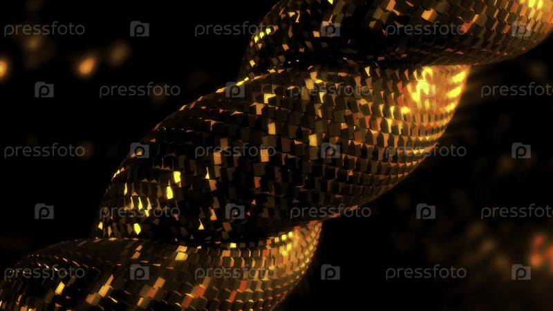 Золото и черный абстрактный фон с металлической веревкой, похожей на чешую змеи. Движение. Скручивающийся металлочерепица на блестящем фоне, бесшовная петля