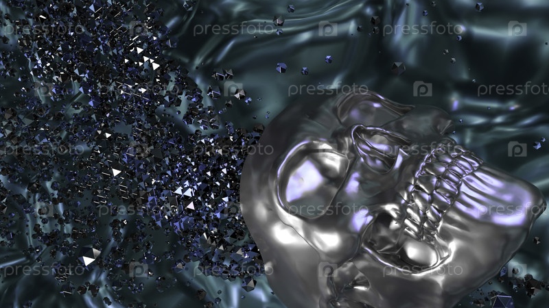 Движущийся поток частиц из черепа. Дизайн. Абстрактная анимация крана, тонущего в жидкости с текущим потоком мыслей. Красочная яркая анимация с черепом в жидкости и частицами