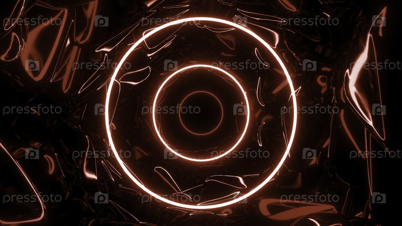 Светящиеся кольца движутся с отражением в туннеле. Дизайн. Яркие светящиеся круги передвигаются по тоннелю с блесками на стенах. 3D-тунел с глянцевыми стенами и перемещающимися неоновыми кругами