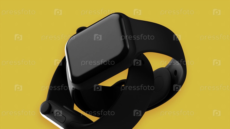 Анимация с ярко-желтым фоном и медленное движение черных умных часов.Движение.Презентация нового электронного устройства, современные технологии
