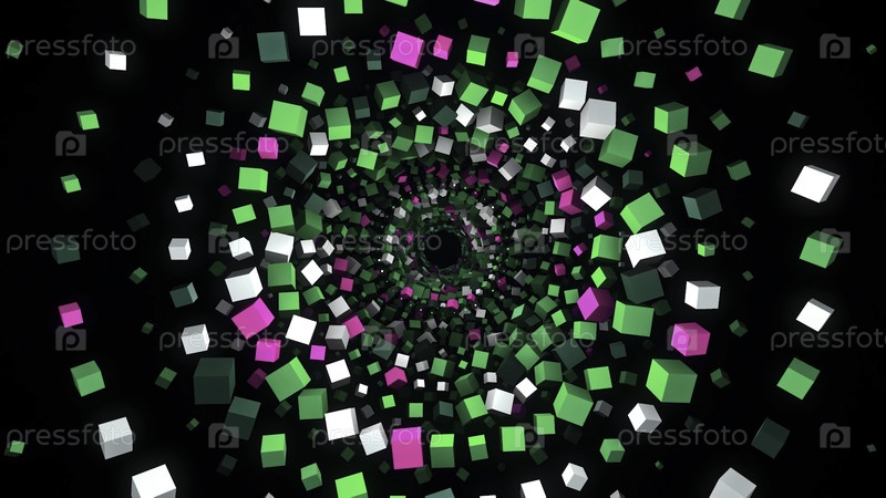 Туннель из 3D цветных квадратов на черном фоне. Анимация. Красивый гипнотический туннель из красочных кубиков. Расстояние от спирали многих ярких кубов