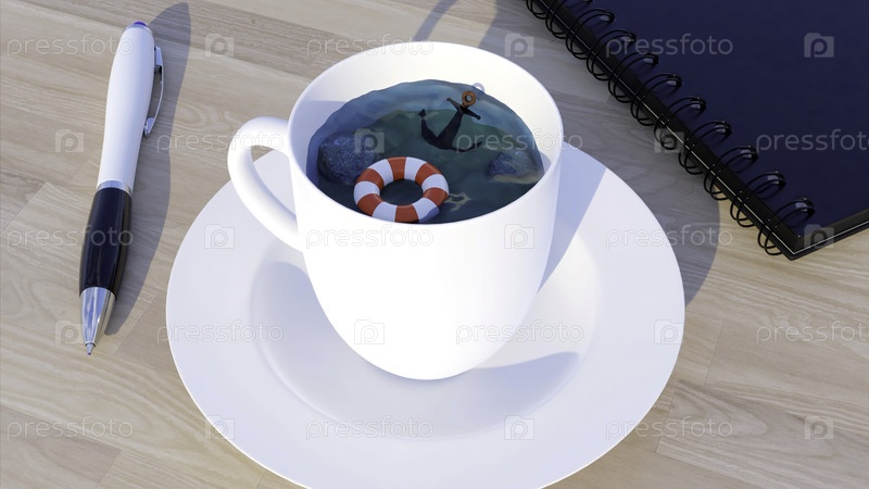 Белая кружка, стоящая на рабочем столе. Дизайн. Интересный натюрморт сделан в анимации, где вода наливается в кружку, красная спасательная линия и черное якорь
