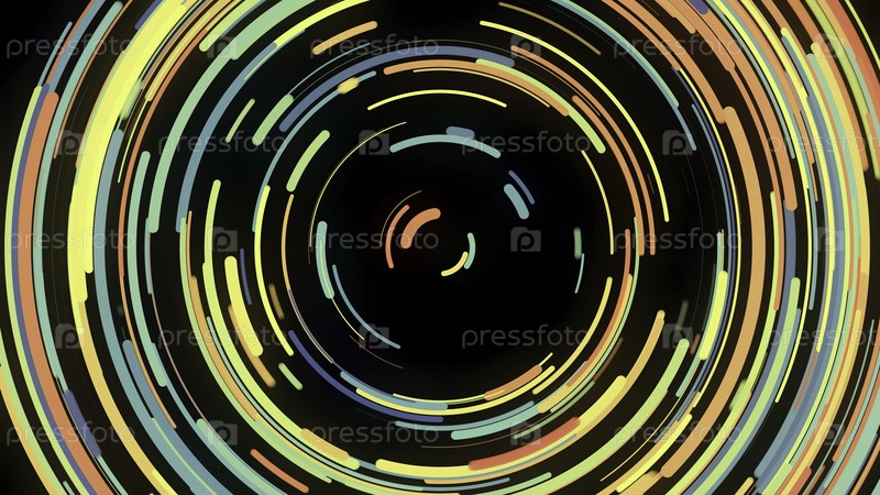 Абстрактная анимация красочно извилистой спирали штрихов. Анимация. Красивая неоновая спираль коротких линий скручивается, как диско-диск на черном фоне