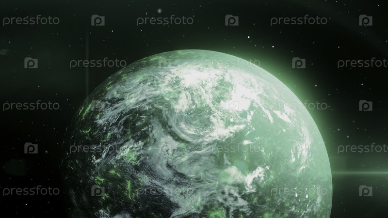 Яркая светящаяся планета в космосе. Движение. 3D-планета вращается во внешнем пространстве с цветным излучением. Планета ярких цветов на фоне звездного космоса