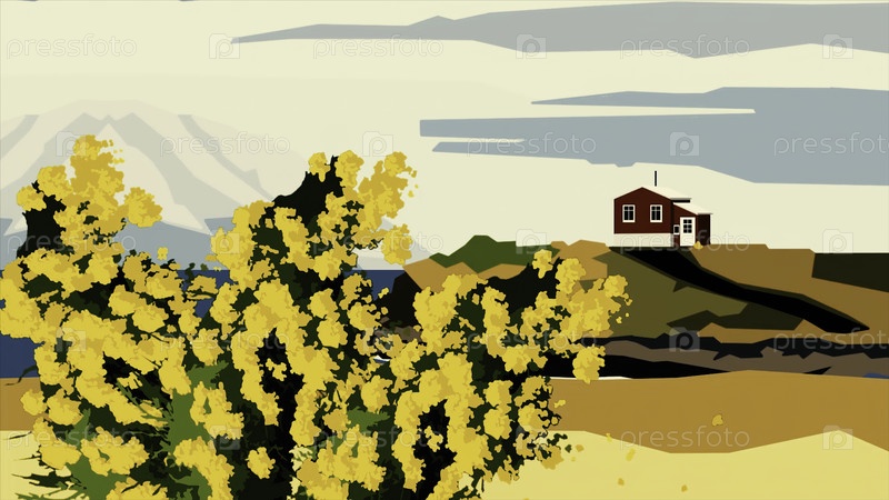 Анимация мультфильмов с ветвями цветущих мимоз, силуэты красного дома и высокой горы в облаках на фоне, абстрактная концепция искусства
