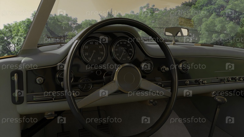 Реалистичный интерьер ретро красивого автомобиля: колесо, приборная панель. Дизайн. Абстрактный старомодный пассажирский дорогой автомобиль