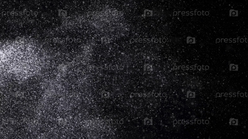 Абстрактная анимация небольших белых частиц, взрывающихся изолированно на черном фоне.Анимация.Белый сухой порошок краски летит в стороны в темноте