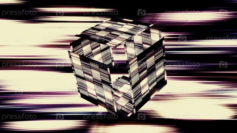Абстрактный светящийся куб, покрытый мигающими цифровыми плитками. Движение. 3D-кубическая форма с движущимися сторонами на фоне мерцающих лучей