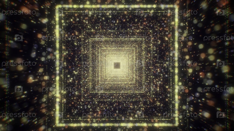 Желтые квадратные рамки блестящих размытых частиц, летящих к экрану