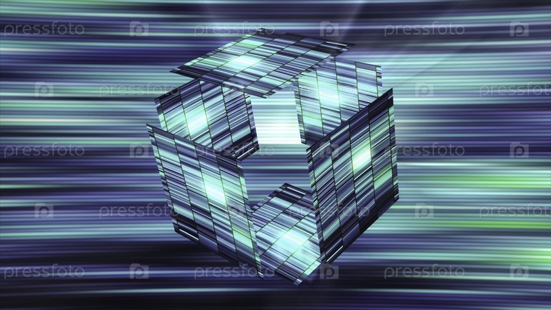 Пустой светящийся куб в киберпространстве.Движение.Футуристический сияющий куб, разлагающийся на части в киберпространстве.Блестящий полосатый куб на фоне красочных линий