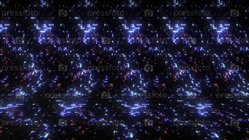 Яркие сверкающие квадраты на современном фоне.Движение.Многие квадратные пиксели сияют в пространстве.Фон из мозаичных пикселей в стиле дискотеки