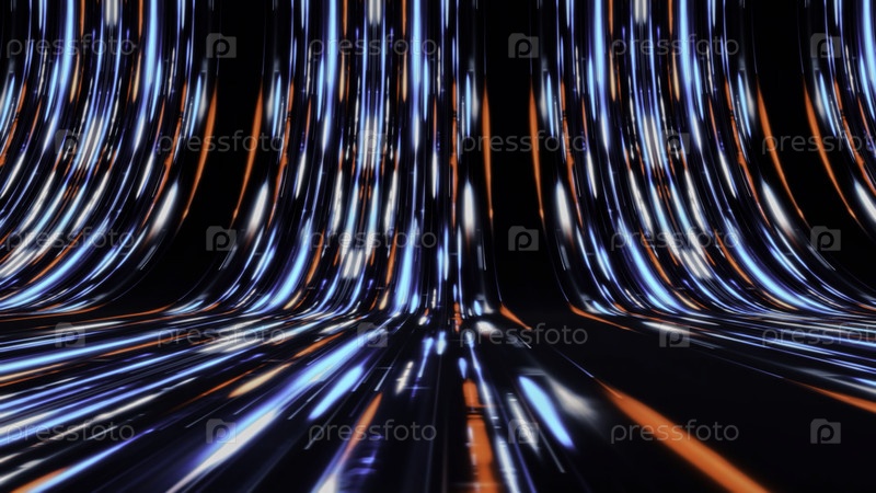 Неонные потоки движутся по изогнутой траектории на черном фоне. Анимация. Яркие дорожки с перемещающимися неонными линиями для гонок в киберпространстве