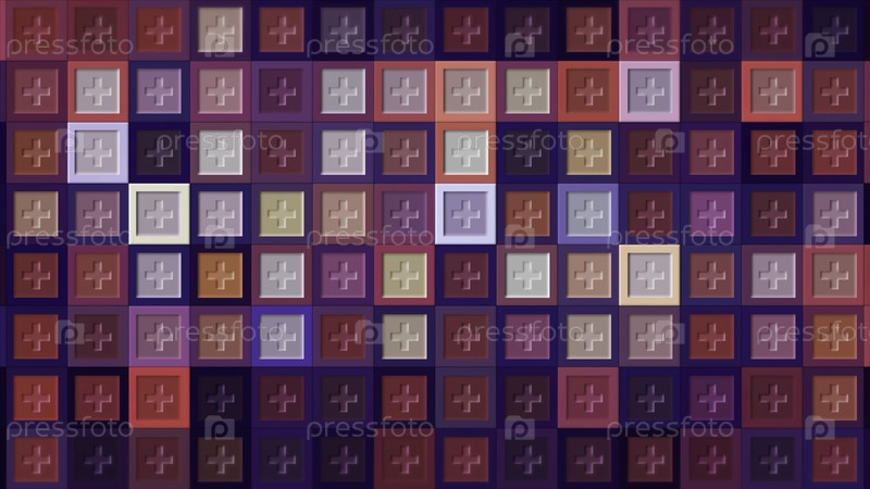 Абстрактные розовые и фиолетовые квадраты с медицинскими крестами, блестят случайным образом.Движение.Плюс знак внутри квадратных форм, бесшовная петля