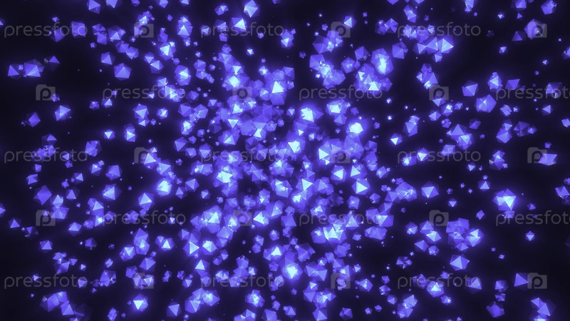 Сияющие геометрические частицы в потоке. Движение. Распространяющийся поток сверкающих геометрических частиц. Распространение геометрических блестящих шаров на черном фоне