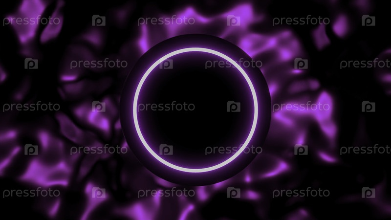 Абстрактный темный круг, окруженный узким кольцом неонов. Дизайн. Жидкий розовый фон и круг посередине