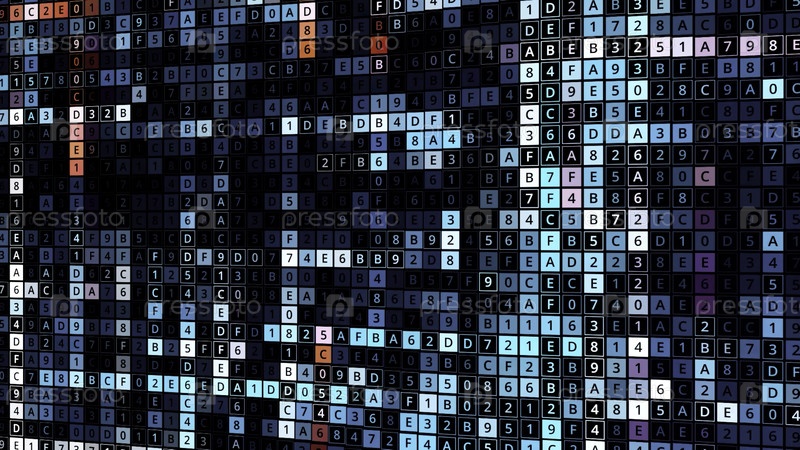 Поле с изменяющимися числами. Анимация. Компьютерное поле с генерируемыми цифрами и пульсирующими волнами. Волна на поле с ячейками меняющихся цветных цифр и букв