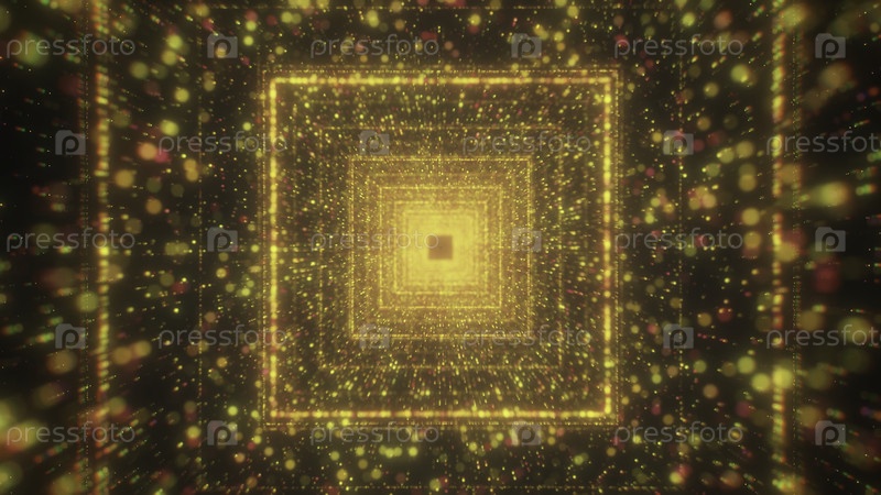 Яркий мерцающий туннель с квадратами. Движение. Красивый квадратный тоннель с потоком частиц на черном фоне. Космический туннель со светящимися частицами и квадратными линиями