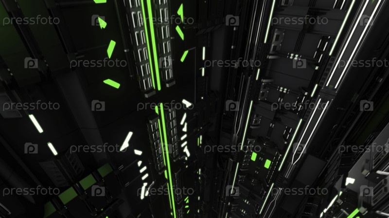 Лифтовый коридор в здании, освещенный зеленым светом.Летание через футуристический вал лифта, бесшовная петля, абстрактный технологический фон