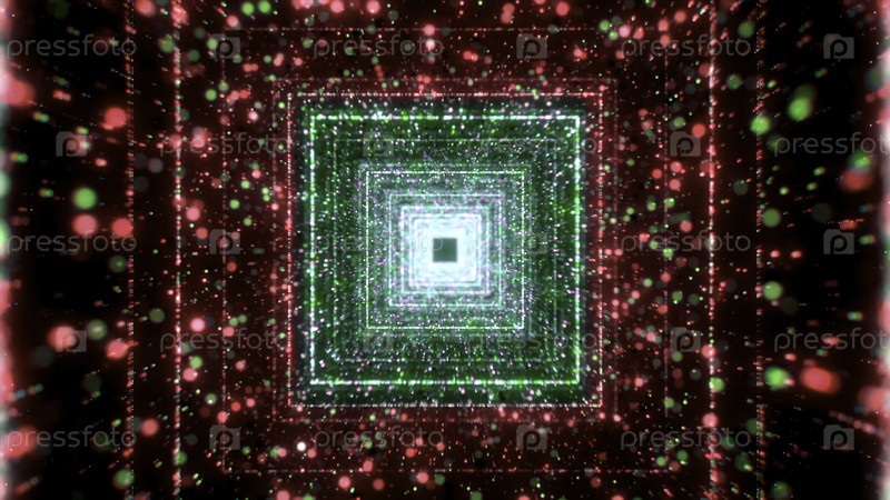 Квадратный коридор с светящимися линиями и частицами. Движение. Красивый космический коридор с красочными частицами. Перемещение через квадратный туннель со множеством частиц