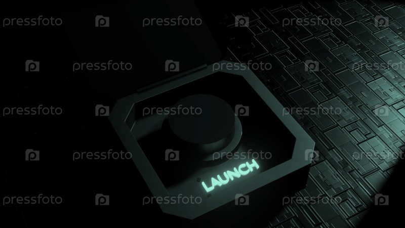 3D-анимация кнопки атомной бомбы.Дизайн.Кнопка запуска ядерного оружия сближается со светом аварийного сигнала