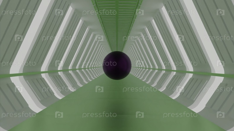 3D-туннель в футуристическом стиле с мячом. Дизайн. Черный шар движется по туннелю. Футуристический тоннель с передвигающимся темным шаром