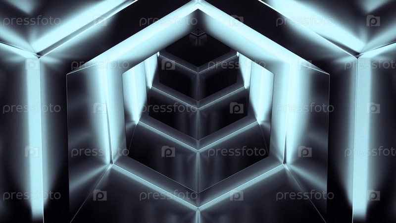 Выход из кибер-тунеля. Дизайн. Шестиугольный 3D тоннель с неоновыми линиями и металлической поверхностью. Обратное движение в кибер-туннеле