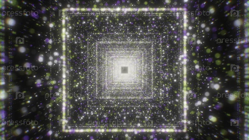 Летающие красивые частицы боке, летящие на черном фоне с туннелем.Движение.Бесконечный коридор узких квадратных силуэтов
