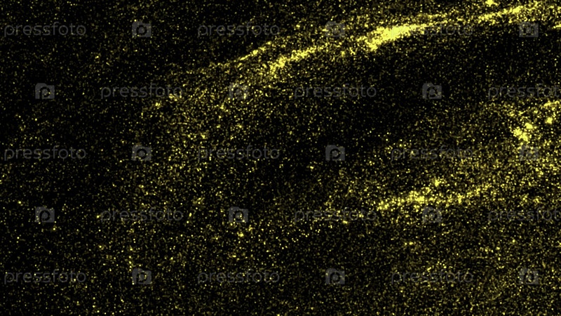 Жидкий золотистый абстрактный фон с протекающими светящимися частицами на черном фоне. Движение. Красивая волнообразная текстура с желтой блестящей пылью