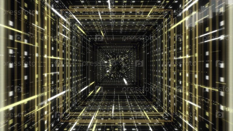 Гипнотическая абстрактная анимация голографического коридора или тоннеля с неоновыми геометрическими узорами и линиями, движущимися на черном фоне