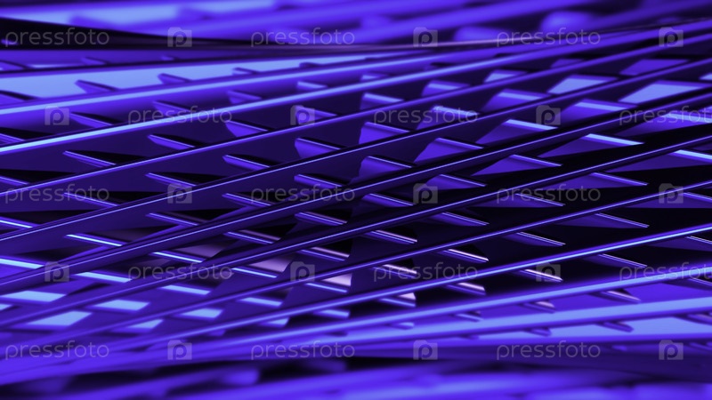 Абстрактная вихревая металлическая трубка, покрытая пересекающимися линиями и отверстиями. Движение. Металлическая решетка из узких полос, образующая вращающуюся трубку в форме синей фигуры